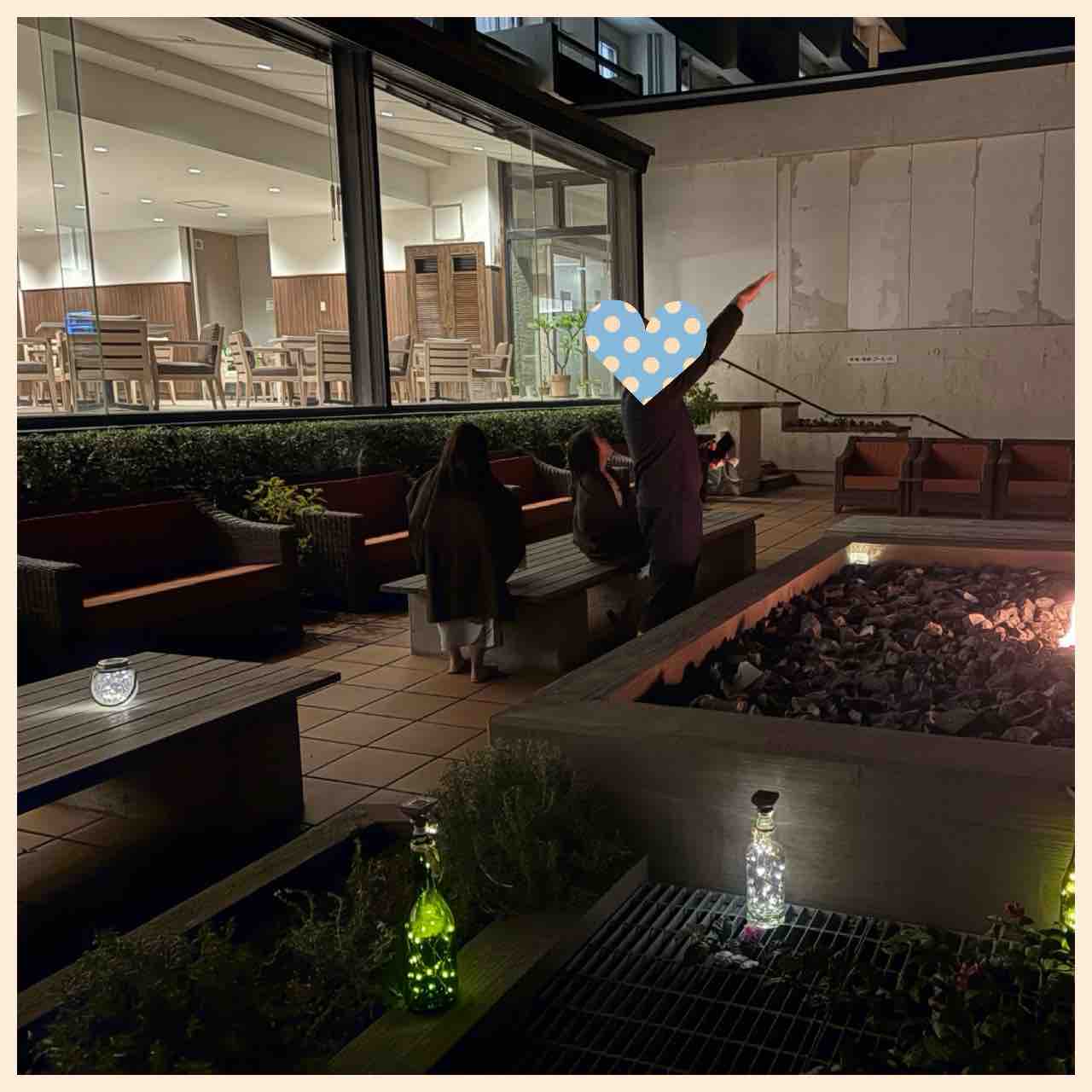 下の娘は歯磨きして、寝る!と言ってベッドに入っていたのですが、私は売店で買い物したかったし、上の娘に「コーヒーラウンジの外にファイアープレイスがあるらしいよ、見に行ってみない?」と話していたら下の娘も「何の話?私も行く!」というので、結局みんなでロビーに行きました。