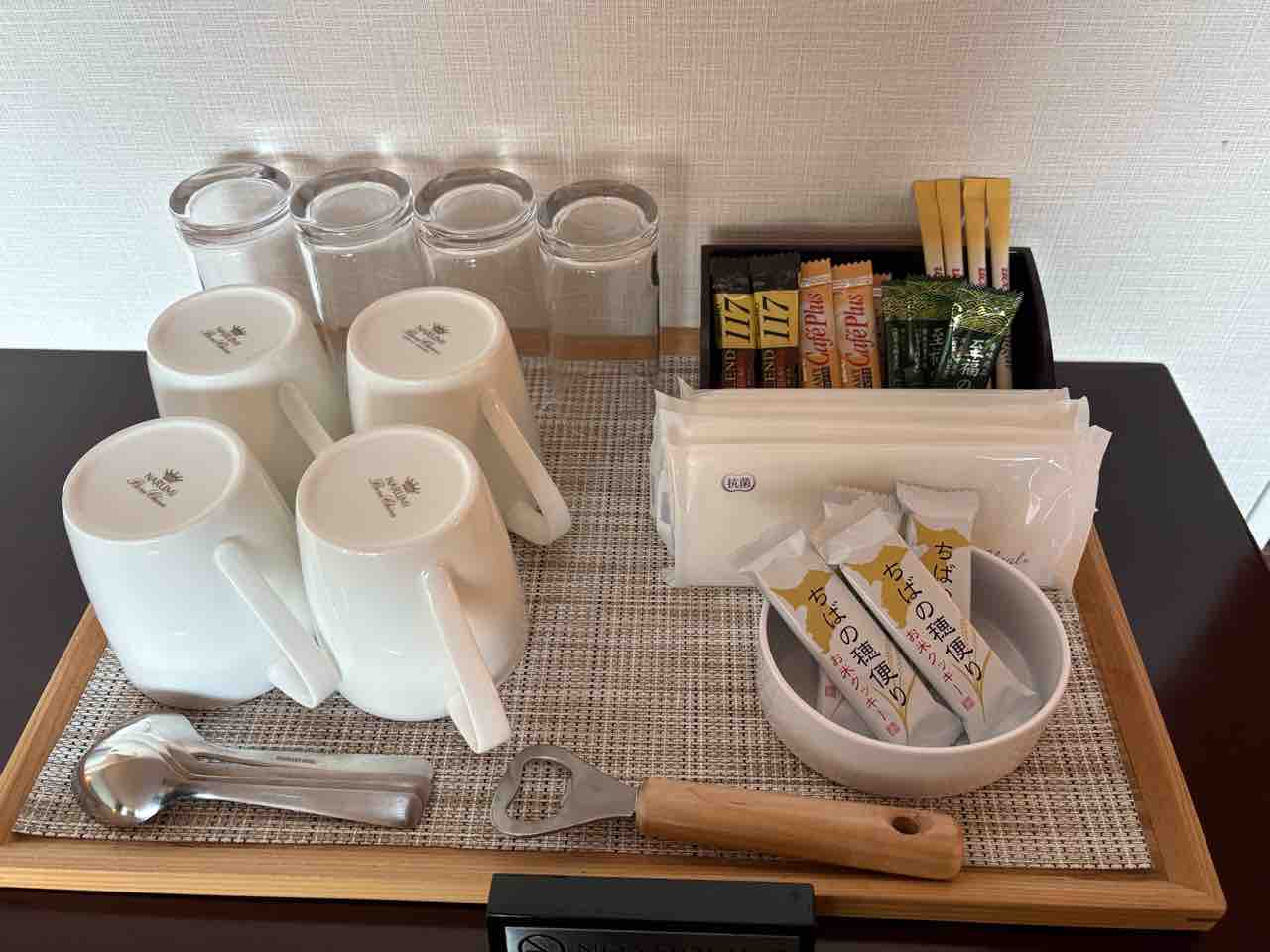 冷蔵庫の上にお湯を沸かせるポットがあり、チェストの上にお菓子、コーヒーやお茶等がありました。