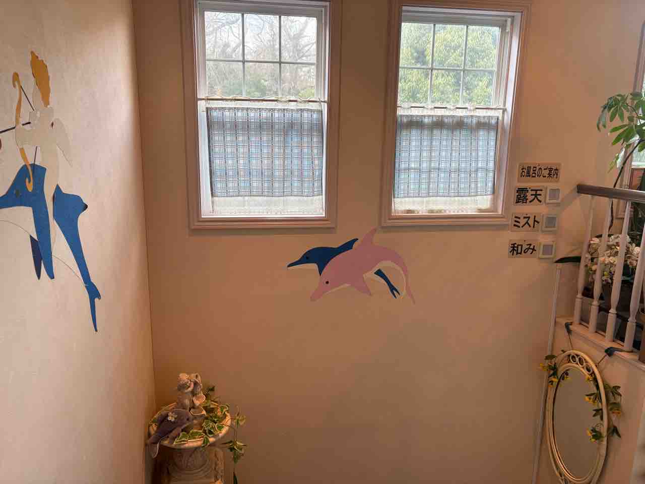 天使のイルカという名前のペンションですが、確かにホテルの外も中も天使とイルカだらけ!すてき