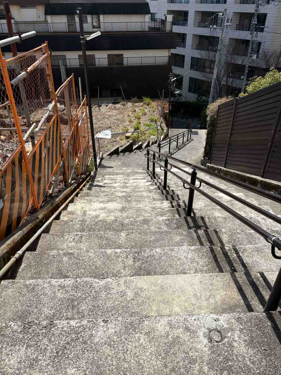 Googleマップに言われるがまま歩いていくと、すごい階段(下り)。