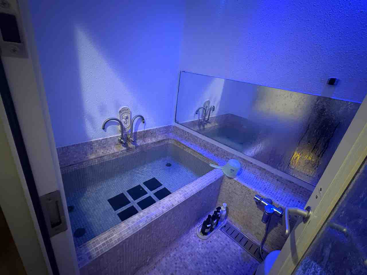 壁にあるリモコンを押すと、3分後ぐらいに天井からミストが出てきます。窓がなく、青い照明のお風呂でした。