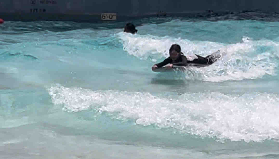 波のプールで浮き輪に乗って浮かんでるだけでも楽しいですが、ボディボードタイムというのがあり、その時間帯は大きい波のプールで1人ずつボディボードに乗れます。