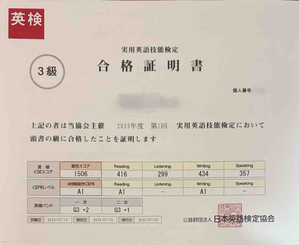 タイトルの通りなのですが、小5の上の娘、英検3級に合格しました