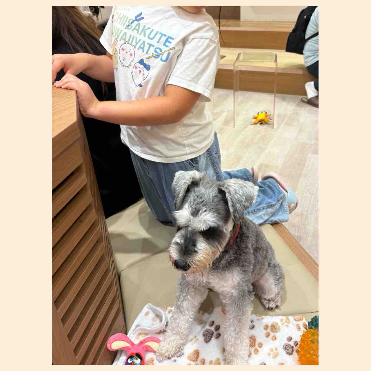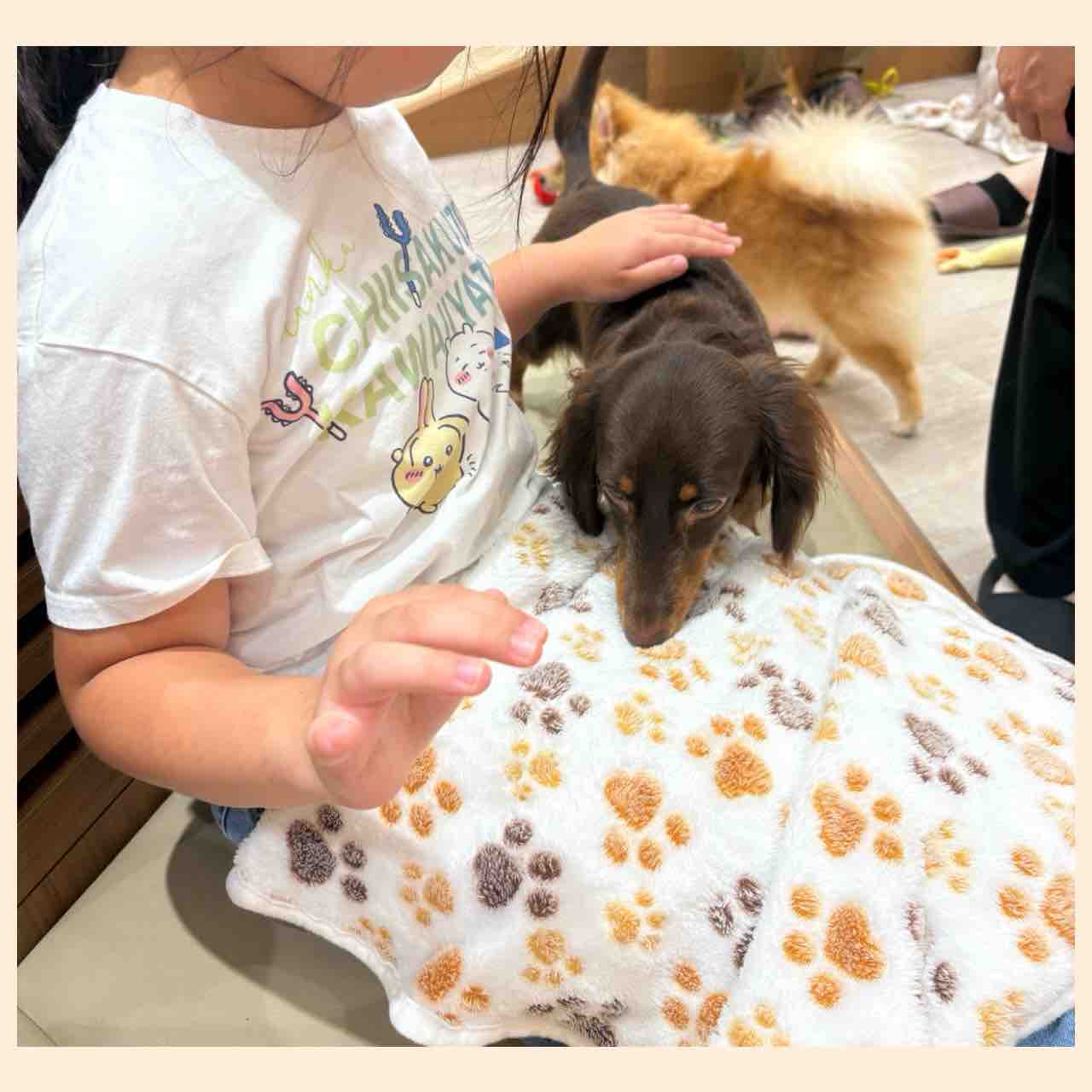 お店のお姉さんがタオルを持ってきてくれて、「これを膝の上に敷くと乗ってきますよ」とのこと。たまに乗ってくるワンちゃんがいました。