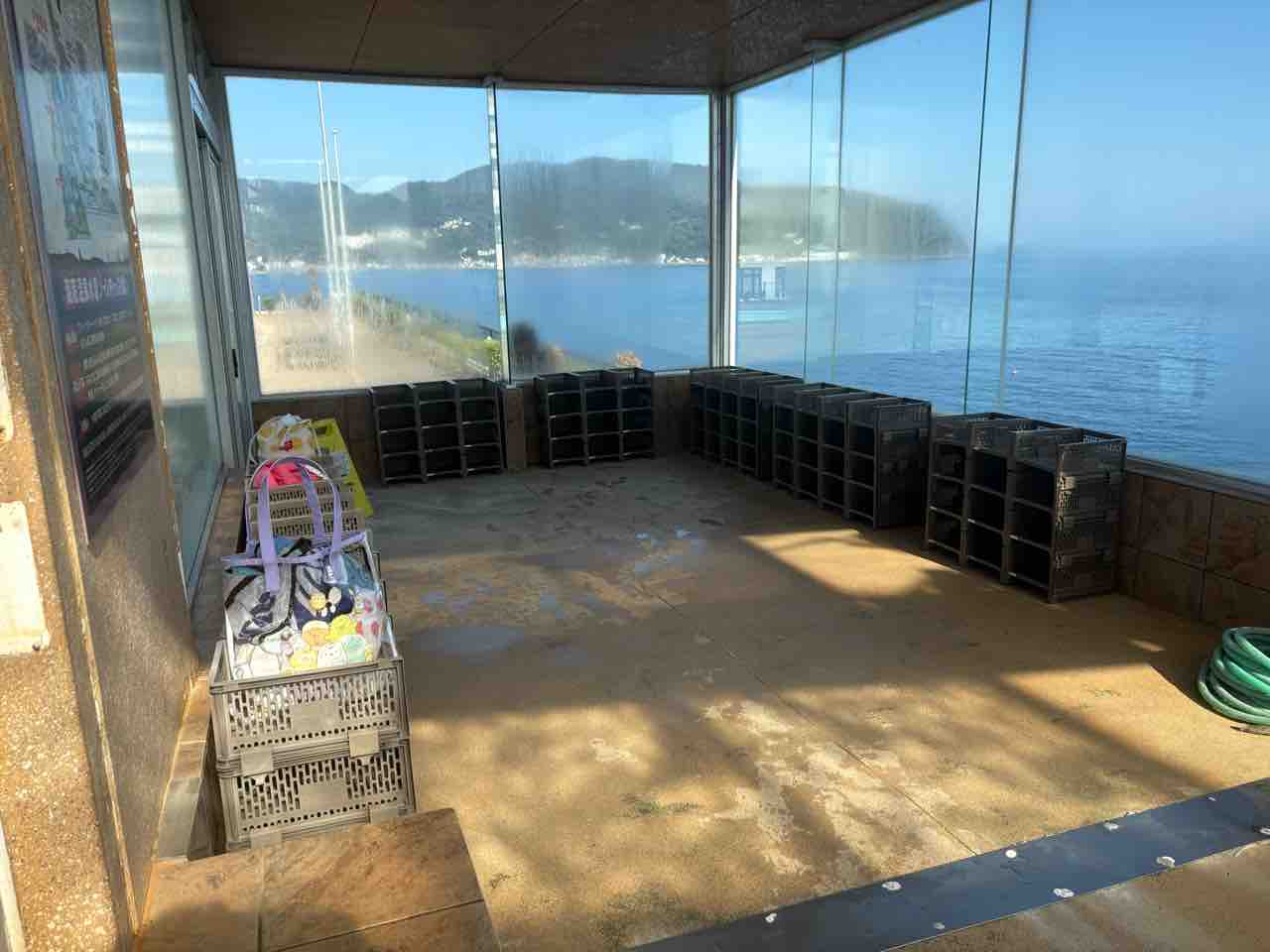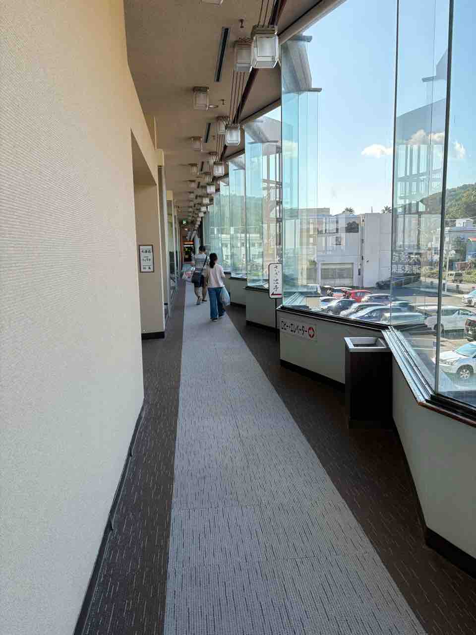 上の通路を歩いて行くと、窓側まで濡れずに進めます。