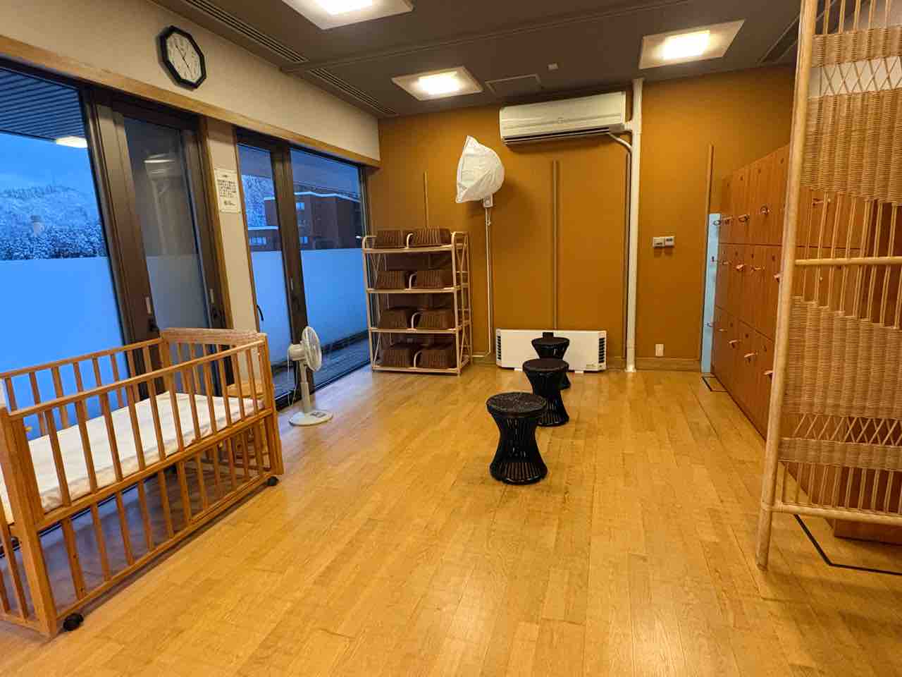 脱衣所。鍵付きのロッカーがありました。ベビーベッドも。