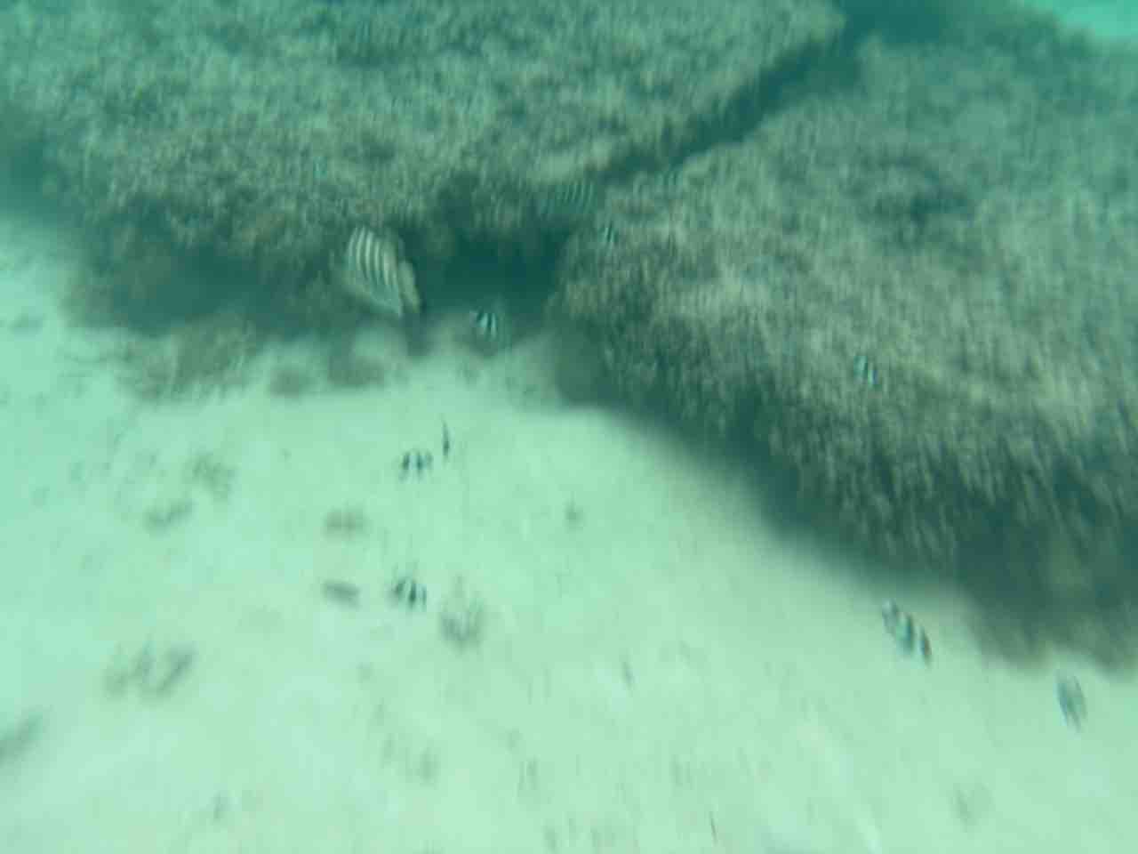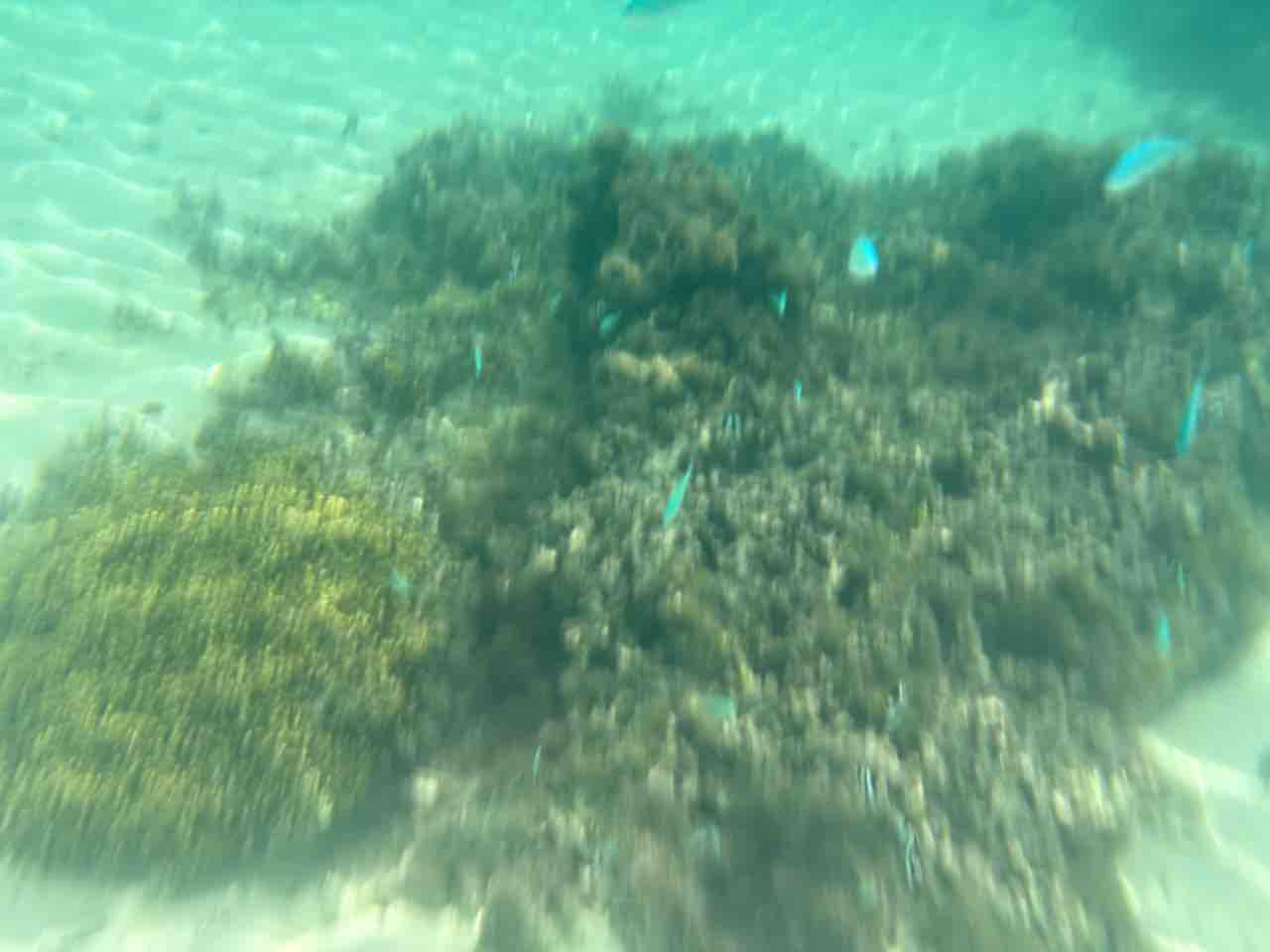 波打ち際から10mぐらい沖まで泳ぐと、深さ3mぐらいになるのですが、珊瑚の塊(1〜3mぐらいのもの)があり、その周りに熱帯魚が何十匹も泳いでいたので、何度かゴーグルだけでそこまで泳いでいき、動画や写真を撮りました。
