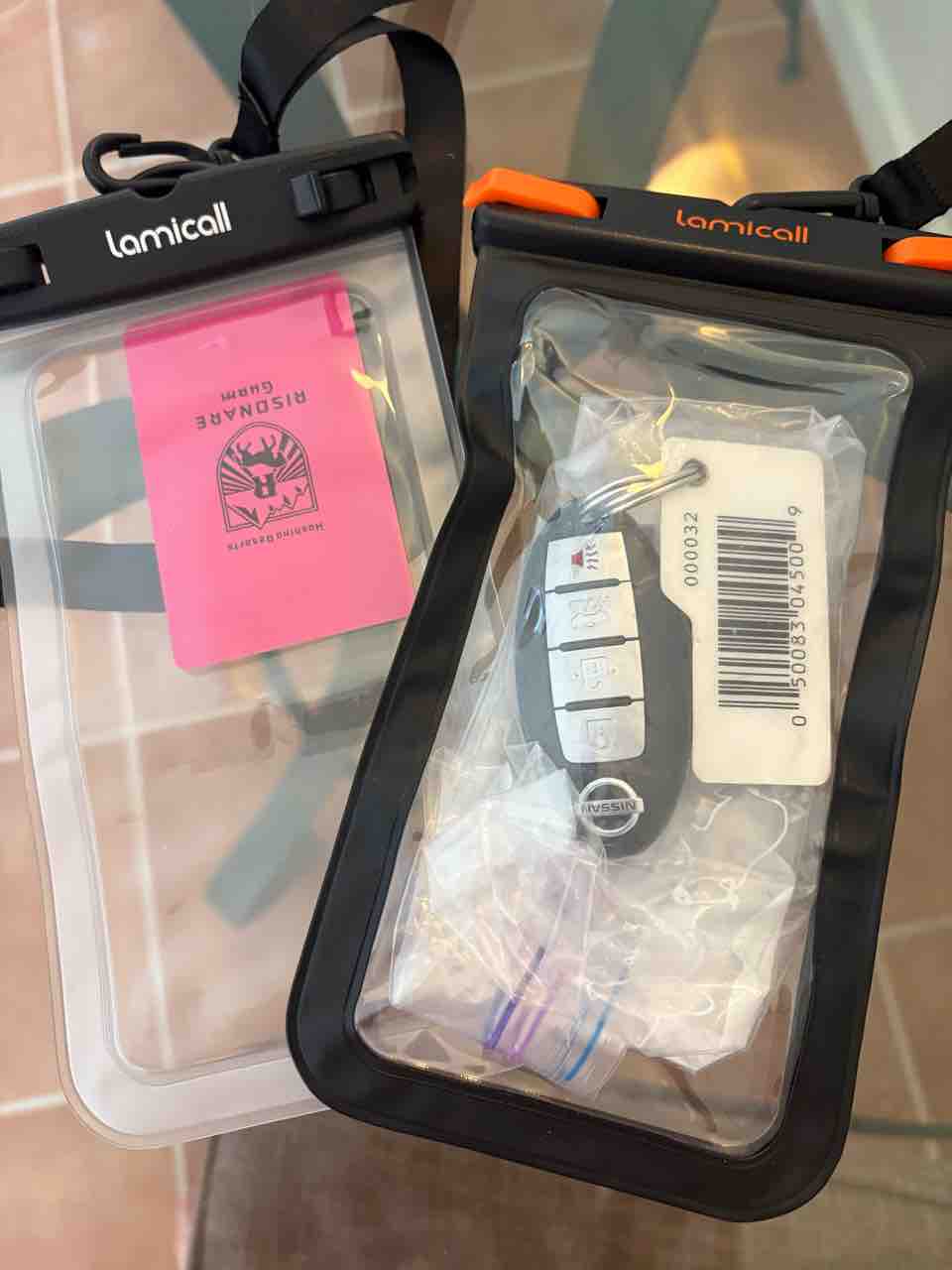 スマホの防水ケースを3つ持っていっていたので、2つにはそれぞれ夫と私のスマホとルームキー、もう1つにはジップロックに入れたレンタカーの鍵を入れました。